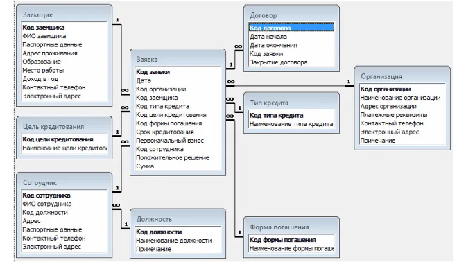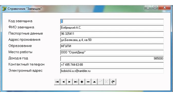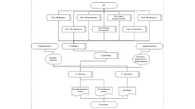 The interaction of an employee with IS is carried out as follows. At the initial stage, the primary information about the loan agreement is analyzed, which includes various documents in paper form. Then, the necessary information is entered in the directory "Client", "Type of loan", "Purpose of lending" and in the process of filling out an application, information is entered in the document "Agreement". Also, in the system it is necessary to fill in a number of auxiliary directories, which include: "Organization", "Employee", "Position", "Loan type", "Repayment form".