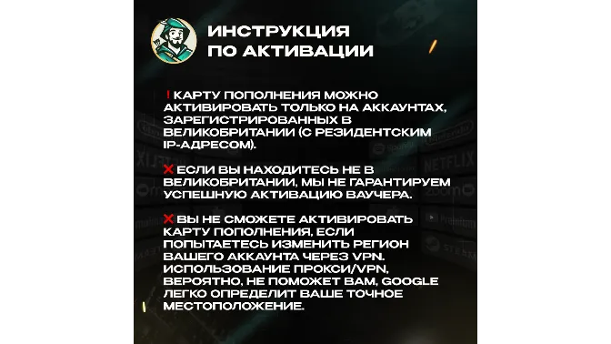 ❌ If you are not located in the UK, we cannot guarantee successful activation of the voucher.