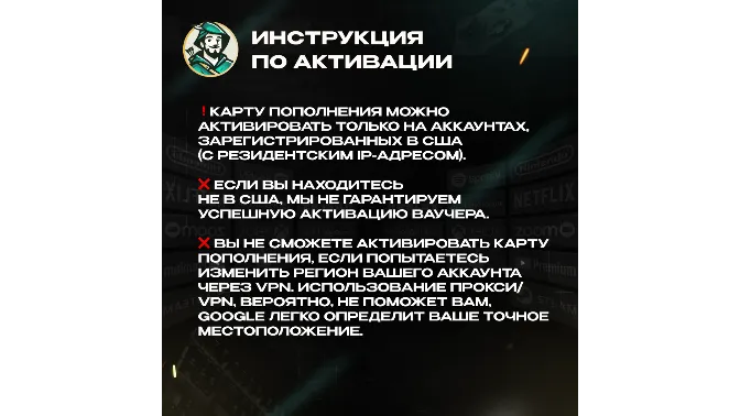 ❌ Если вы находитесь не в США, мы не гарантируем успешную активацию ваучера.