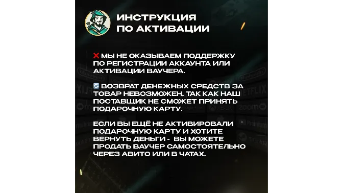 🔄 Возврат денежных средств за товар невозможен, так как наш поставщик не сможет принять подарочную карту. Это связано с тем, что карта могла уже быть активирована или повреждена. Мы не сможем продать её другому человеку. Если вы ещё не активировали подарочную карту и хотите вернуть деньги — вы можете продать ваучер самостоятельно через Авито или в чатах.