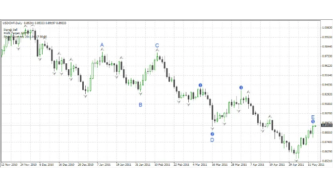 На втором скрине видно, что образуется вершина с цифрой 5 в кружке. От этой вершины цена, вероятно, покатится вниз. Здесь приведён пример, когда нужно открывать позицию на продажу со Стоп-лоссом выше крайней верхней цены, над которой расположена цифра 5 в кружке. На скрине изображен идеальный вход в рынок на продажу. Как мы и предполагали цена пошла вниз, что видно на 3-ем скрине. Кстати на нём изображена цена, при которой желательно закрыть позицию на продажу. Как видно по скриншотам мы заработали с помощью нашего индикатора около 6000 пунктов, что при объёме 0.10 лота составило более 600 $.