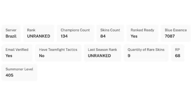 💎 После покупки вы получите премиум-аккаунт League of Legends 405-го уровня с рейтингом «Без рейтинга», 134 чемпиона и 7087 единиц Синей эссенции. В него входят 9 редких скинов. Кроме того, вы получите аккаунт Valorant, доступный по той же электронной почте. Мы предоставим вам полные данные аккаунта Riot Games, а также учётные данные для связанного адреса электронной почты, что позволит вам привязать свой адрес электронной почты и свободно обновлять данные и настройки аккаунта.