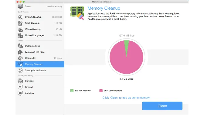 The Memory Cleanup function can give your Mac a noticeable performance boost. If it’s really «dirty», Movavi's OS X cleaner can make it run up to 2.5 times faster!