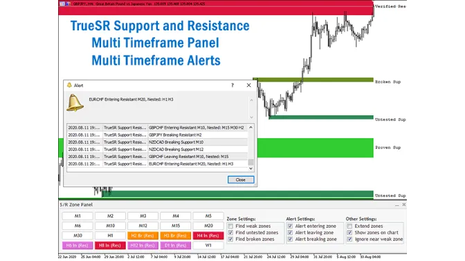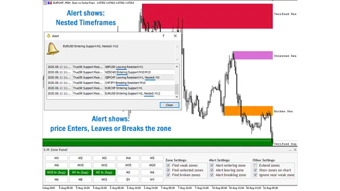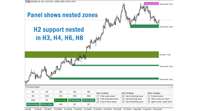 This metatrader 5 indicator is a multi-timeframe panel and alert that finds nested support and resistance zones for all timeframes and gives alert when price has interaction with those zones.