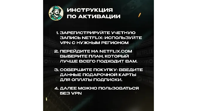 Карта подходит только для аккаунтов Netflix с регионом БРАЗИЛИЯ. Код необходимо активировать в течение 1 дня после покупки.