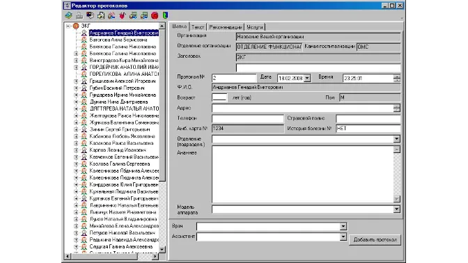 «Редактор протоколов функциональной диагностики» может быть использован как персонально одним врачом, так и группой врачей медицинского кабинета, отделения или учреждения. Настройки позволяют учесть любые виды функциональной диагностики, такие как ЭКГ, спирография, стресс-тест, РВГ, РЭГ, электромиография, биомеханика, электроэнцефалография, дуплексное сканирование сосудов, эхокардиография и др.